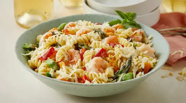 Perfect for spring or summer, this veggie-packed dish combines penne with zucchini, cherry tomatoes, bell peppers, and a light garlic-Parmesan sauce.